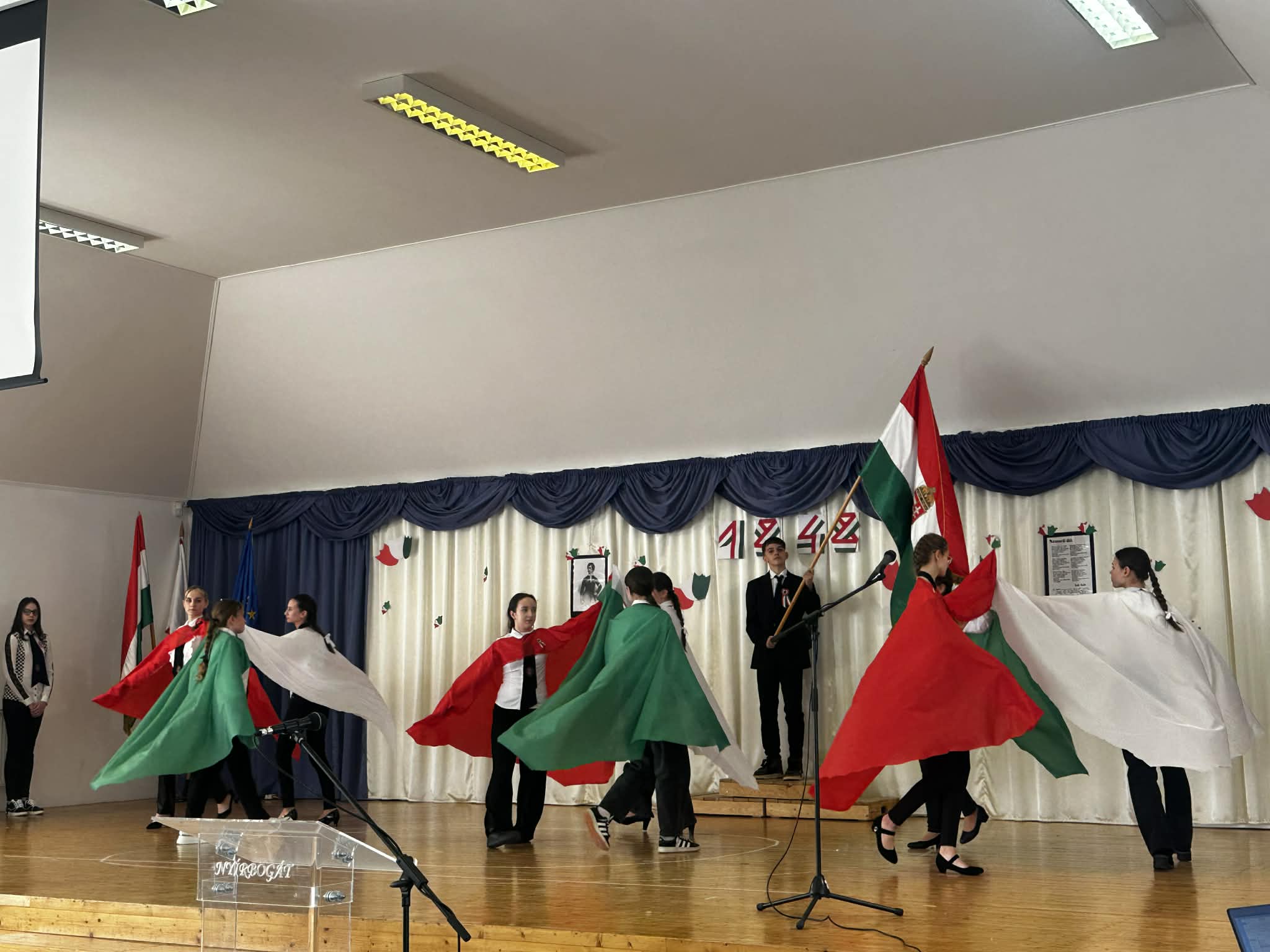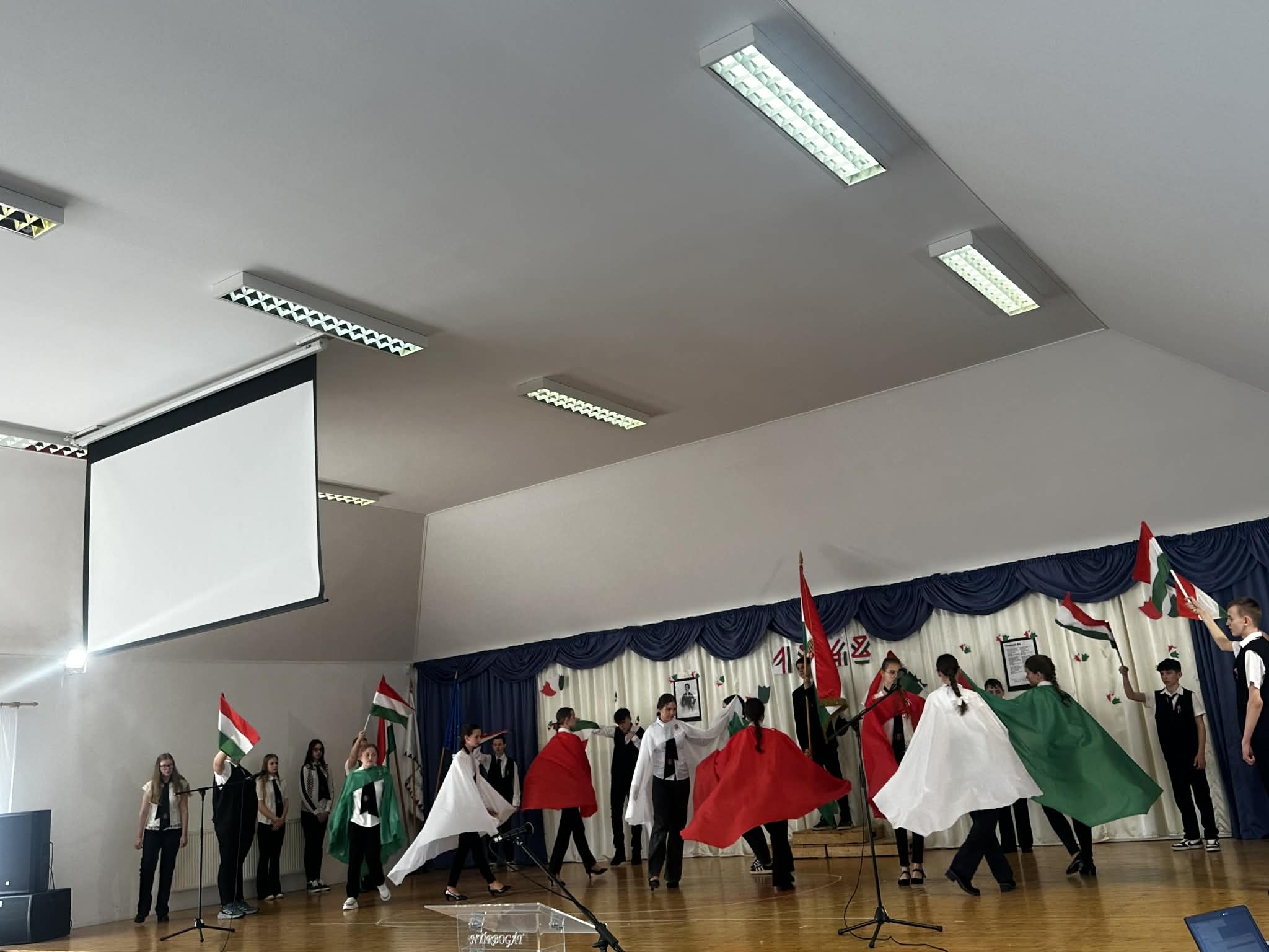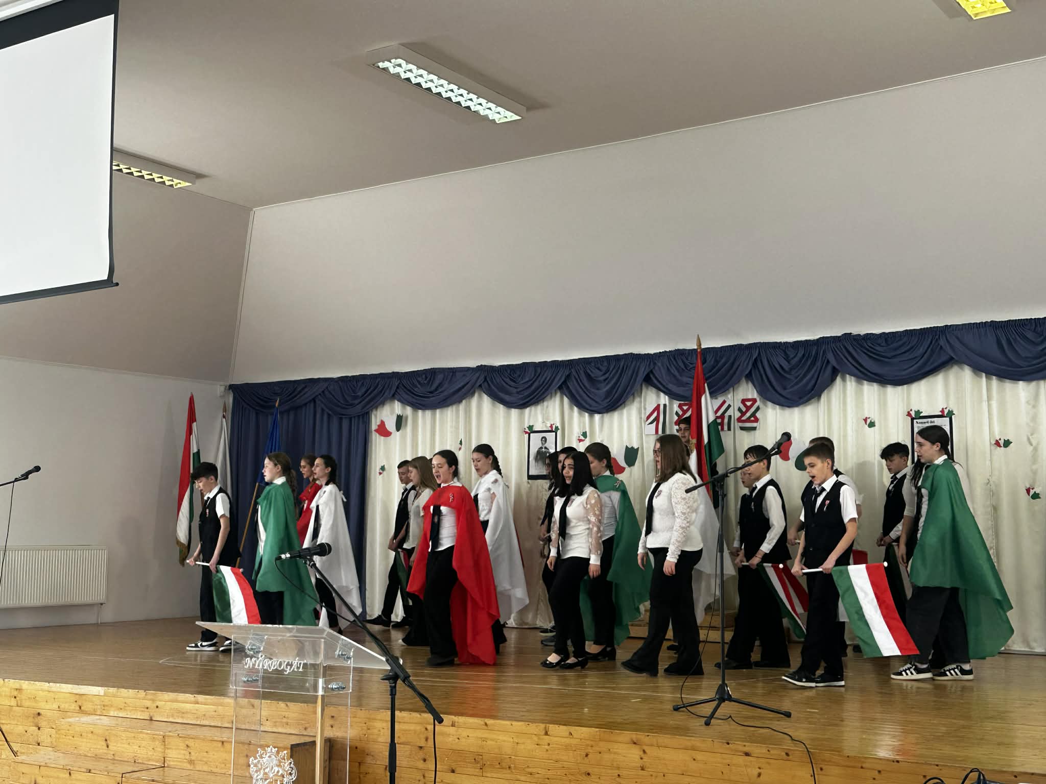 A nap folyamán iskolánk ünnepi műsorát a hetedi évfolyam tanulói adták elő a Városháza Nagytermében. A diákokat osztályfőnökük Somlyai Lászlóné tanárnő készítette fel.