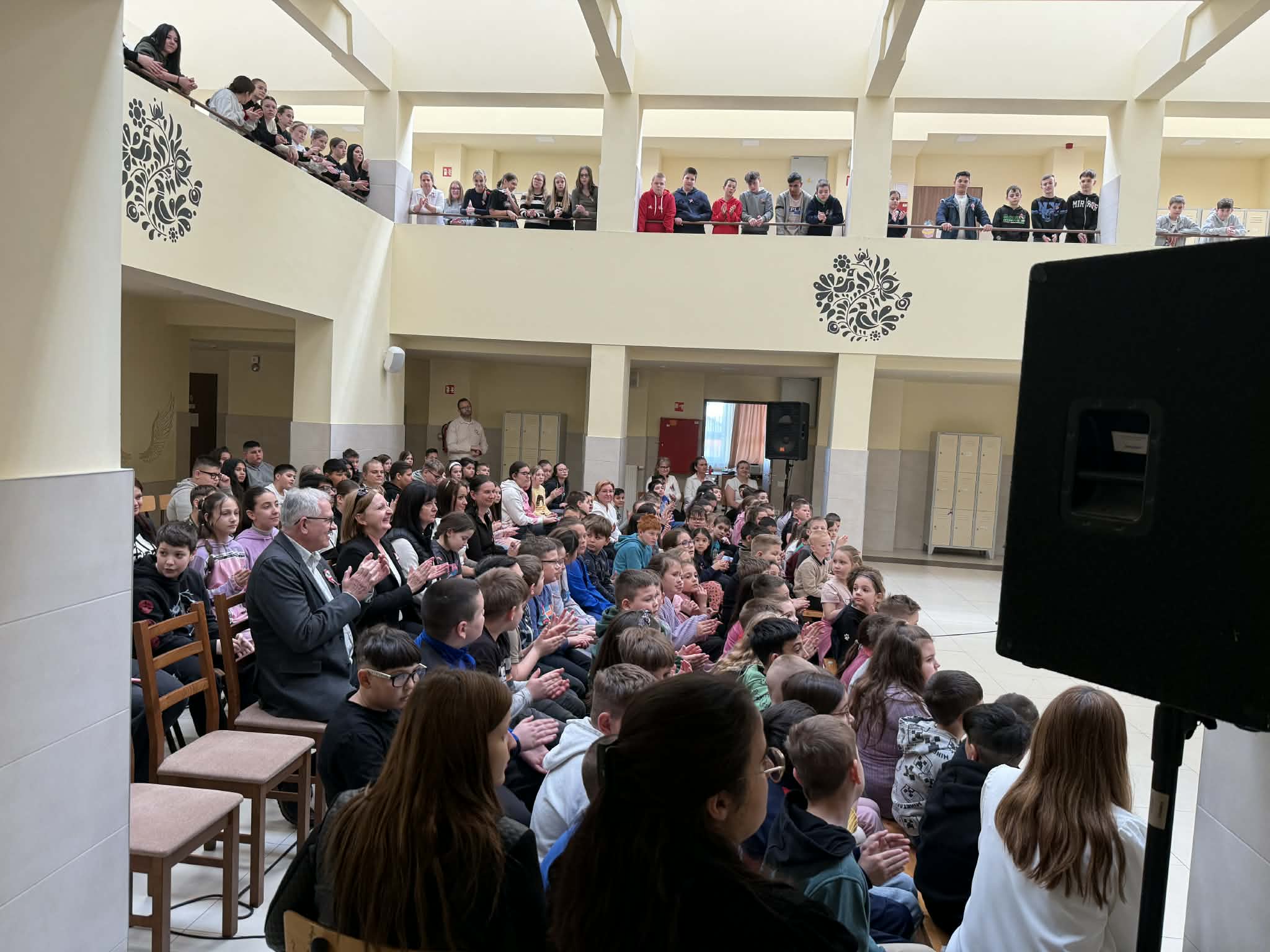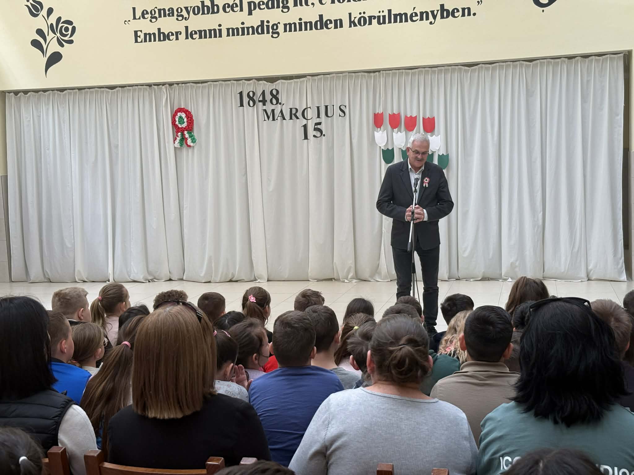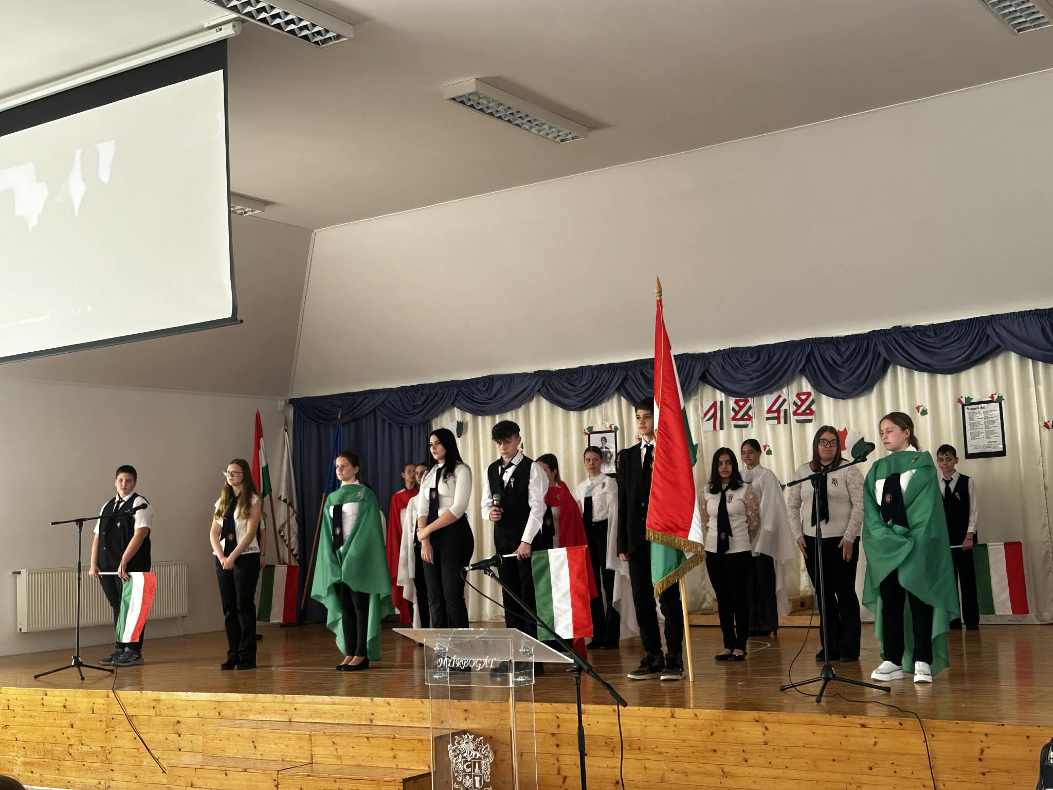 A nap folyamán iskolánk ünnepi műsorát a hetedi évfolyam tanulói adták elő a Városháza Nagytermében. A diákokat osztályfőnökük Somlyai Lászlóné tanárnő készítette fel.