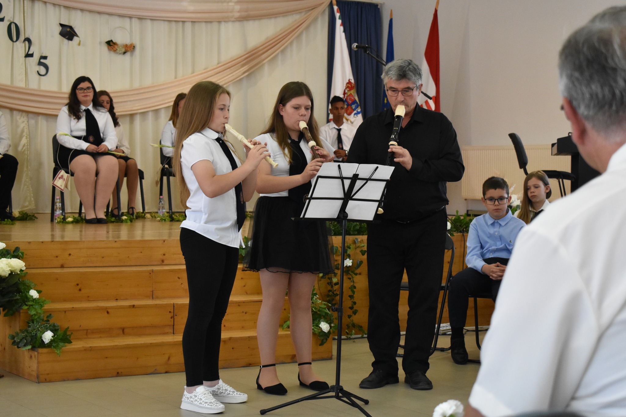 A ballagás meghitt hangulatáról a csodálatos zenei műsorok gondoskodtak: volt furulyaszóló, zongora-előadás, és iskolánk énekkara is színvonalas produkcióval búcsúzott a végzősöktől.