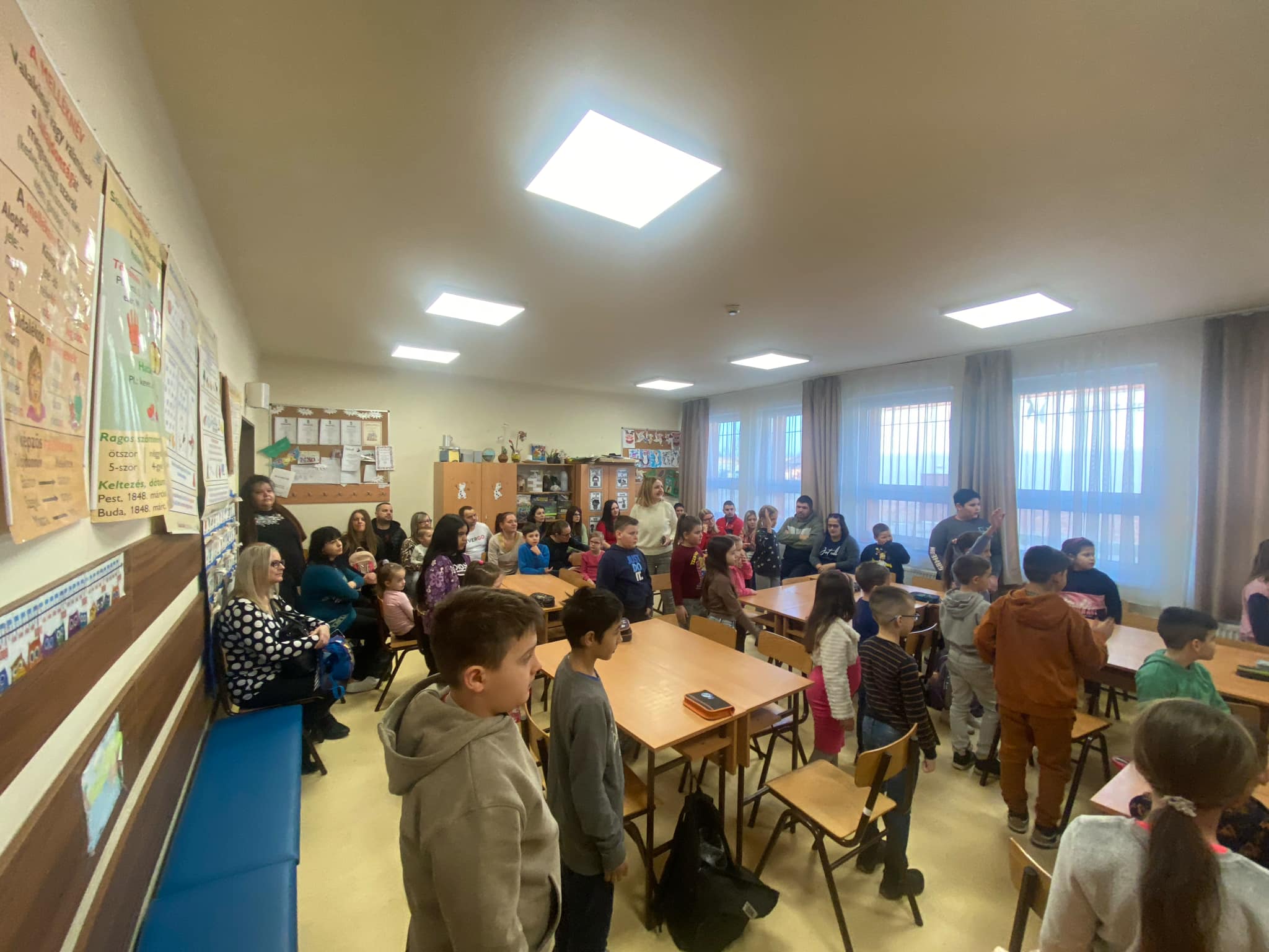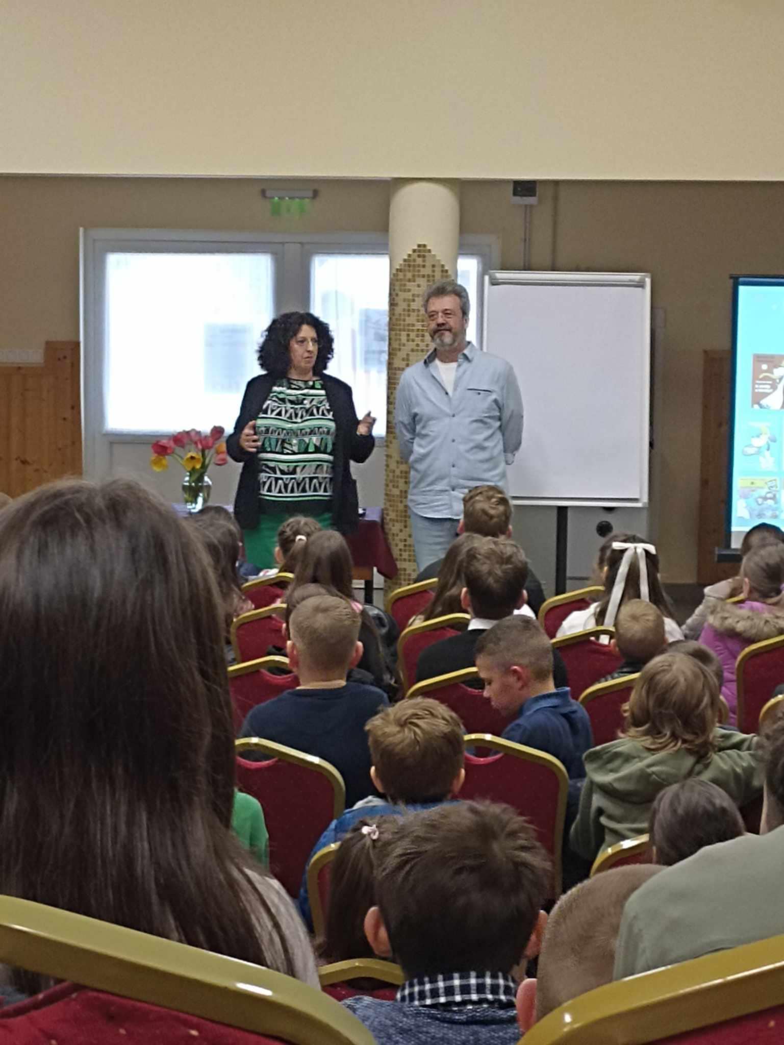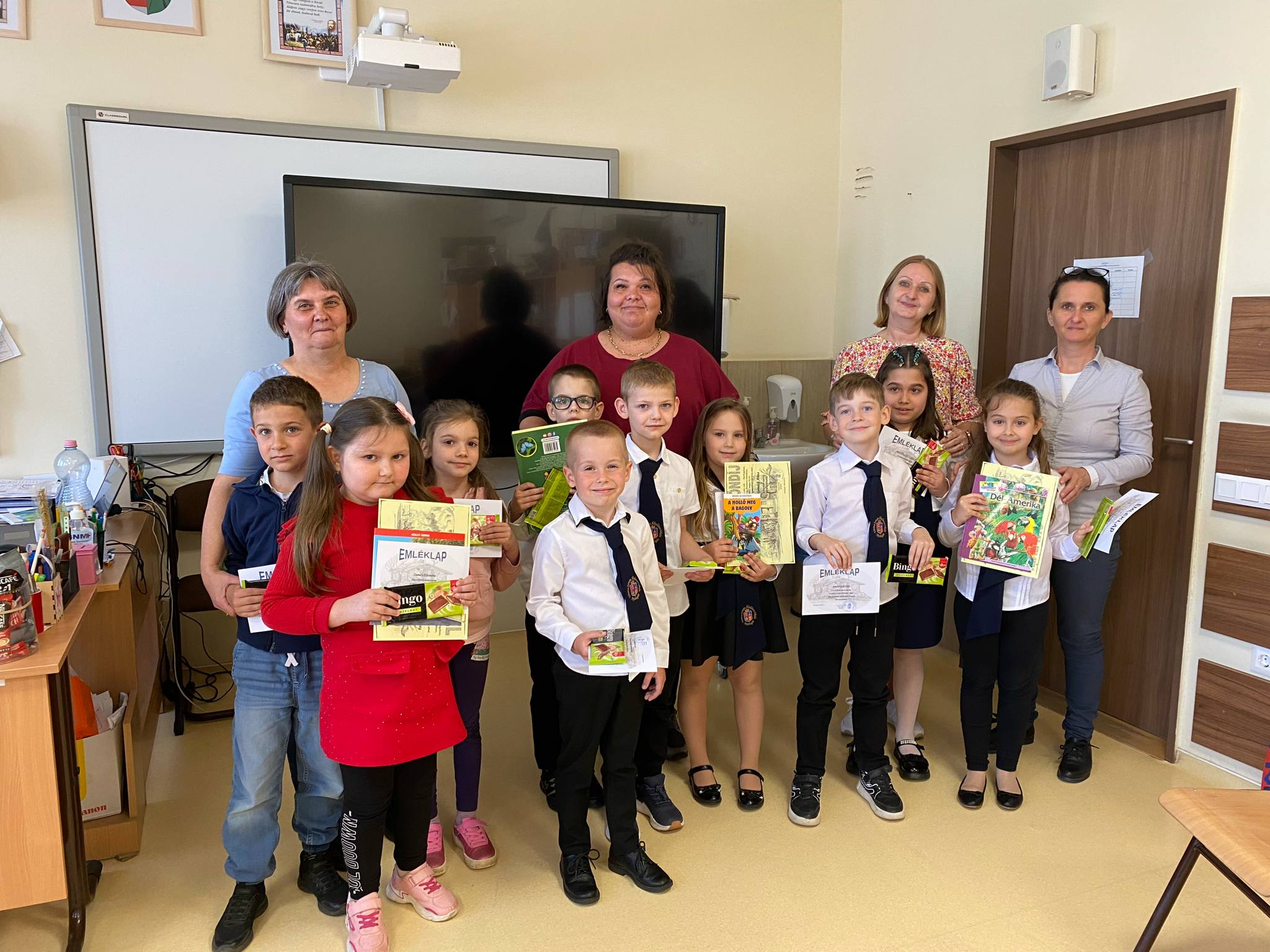 A feladatlapok kitöltése után csodás meglepetésben volt részük a gyerekeknek, hiszen egy író-olvasó találkozó keretében találkozhattak Bosnyák Viktória írónővel és az ő állandó illusztrátorával Dudás Győzővel. Az irodalmi foglalkozáson bepillantást nyerhettek a tanulók A nagy szinoníma hadjárat című könyvébe, melynek kapcsán rögtönzött anyanyelvi csatákat vívtak egymással a gyerekek. A foglalkozás végéna tanulók nagy örömére kezet foghattak és fotózkodhattak az írónővel. Visszatérve az iskolába finom uzsonna várta a versenyzőket.