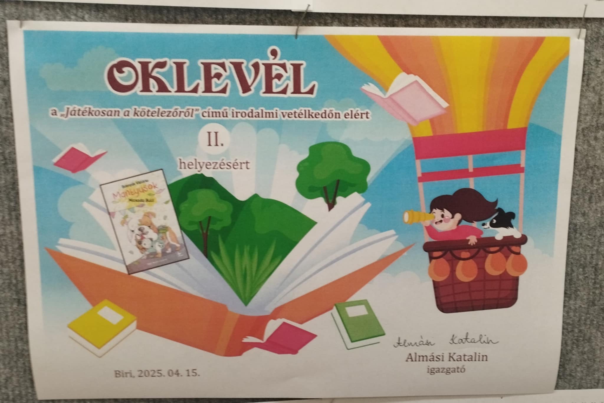 2025.04.15-én Biriben a Dankó Pista Általános Iskola által meghirdetett versenyen vettünk részt, a kötelező olvasmányokról kellett számot adni tudásukról a tanulóknak játékos formában. Az alsó tagozatosok Bosnyák Viktória könyveiből készültek, a felsősök Molnár Ferenc A Pál utcai fiúk című regényét dolgozták fel.