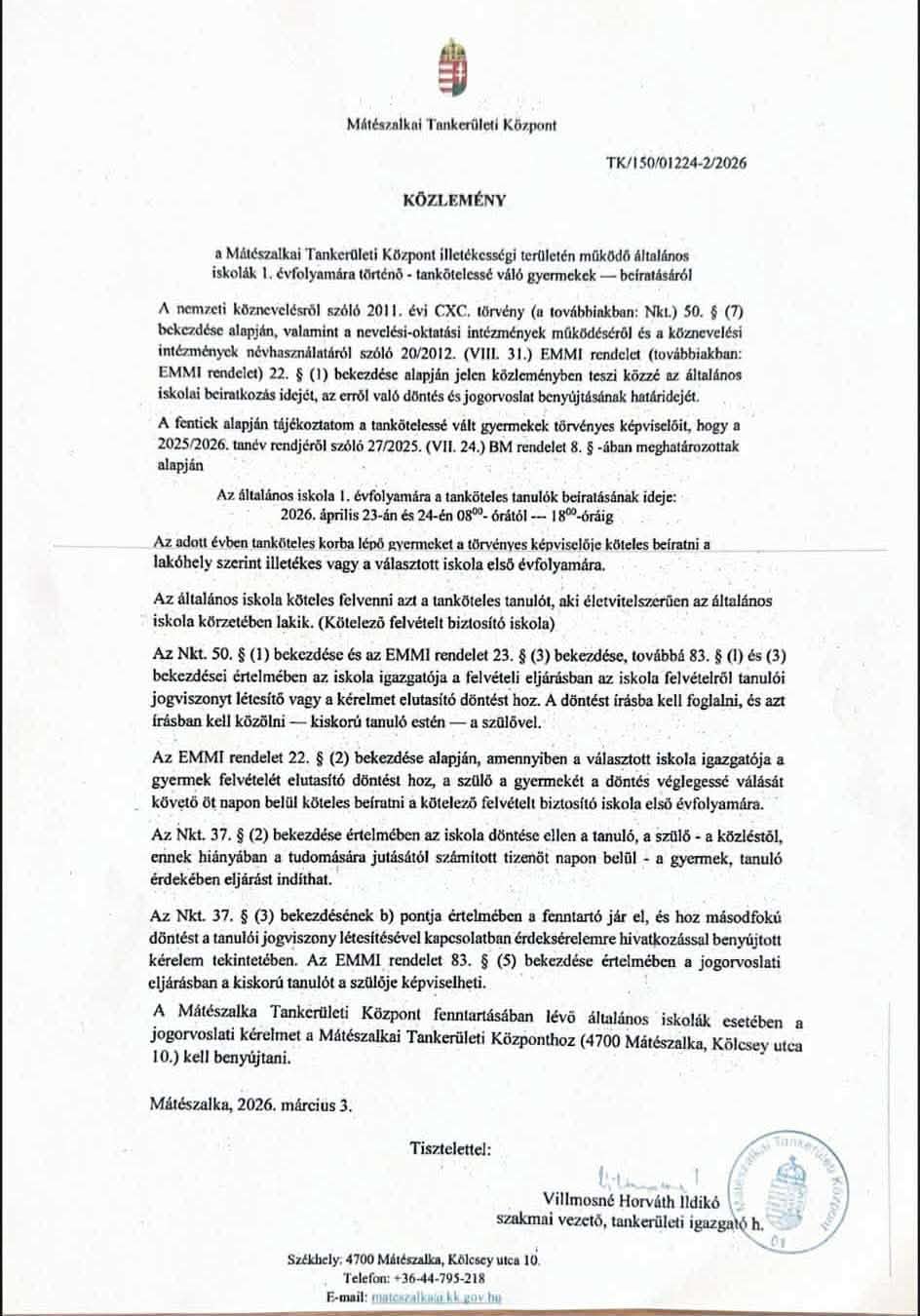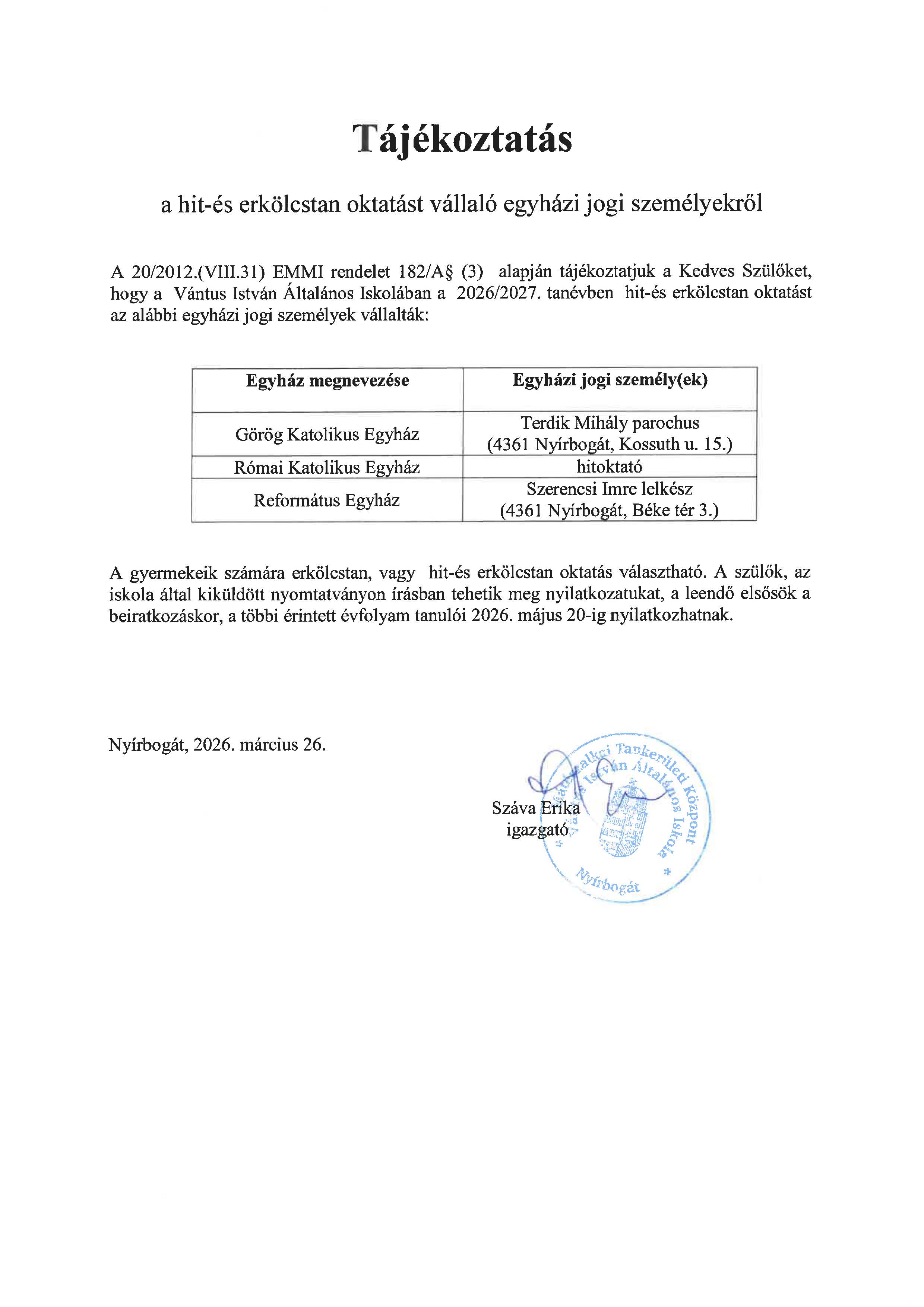 Tajékoztatás - Hit-és erkölcstan oktatás 2026/27 tanév