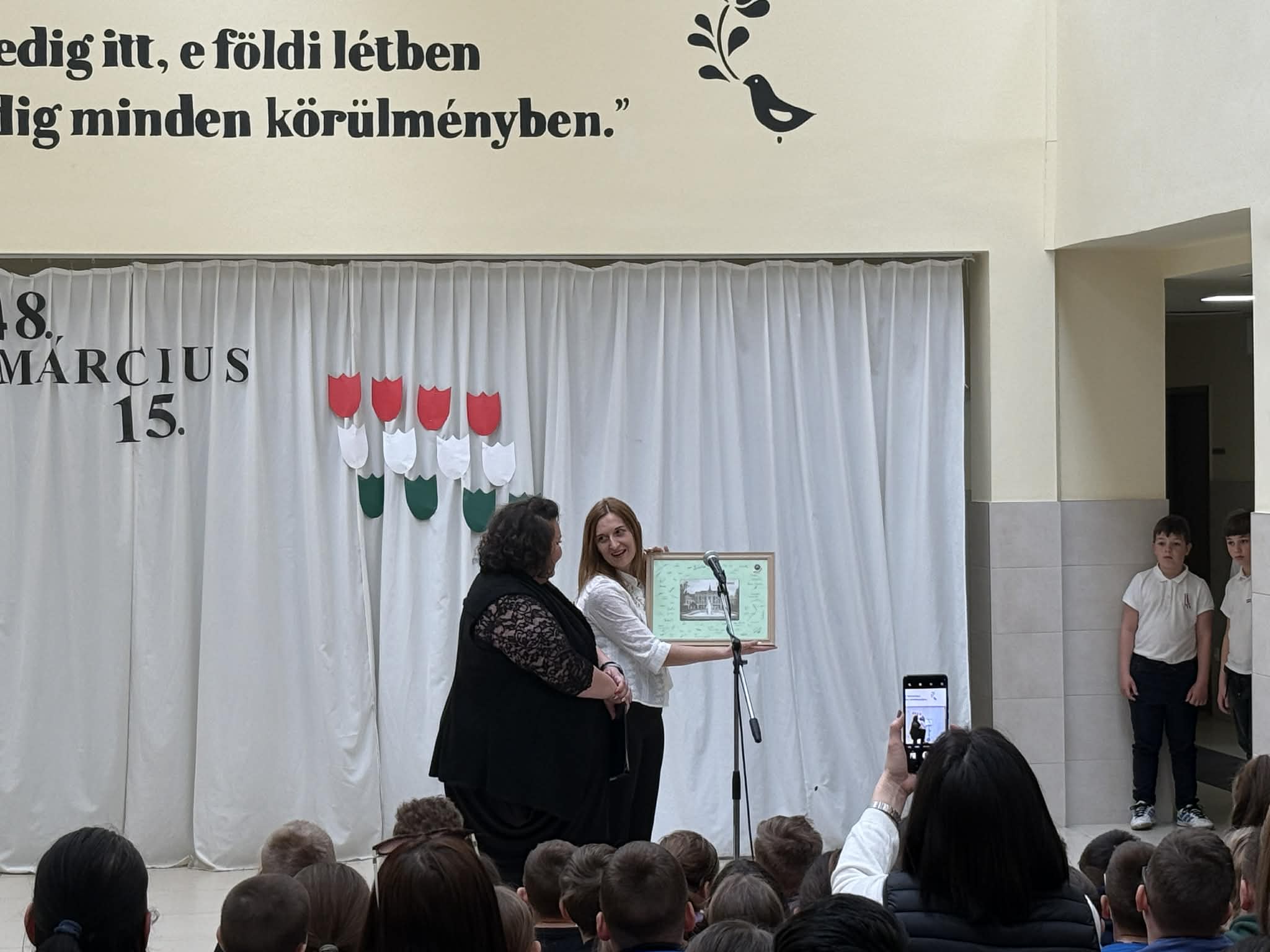 A nap folyamán iskolánk ünnepi műsorát a hetedi évfolyam tanulói adták elő a Városháza Nagytermében. A diákokat osztályfőnökük Somlyai Lászlóné tanárnő készítette fel.