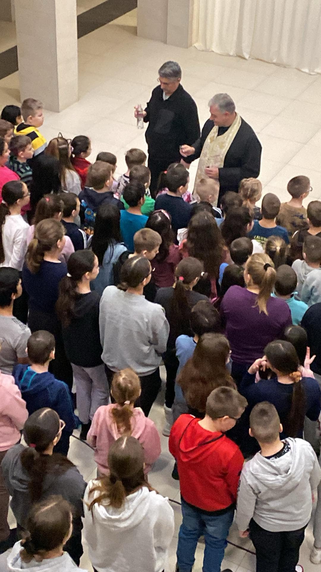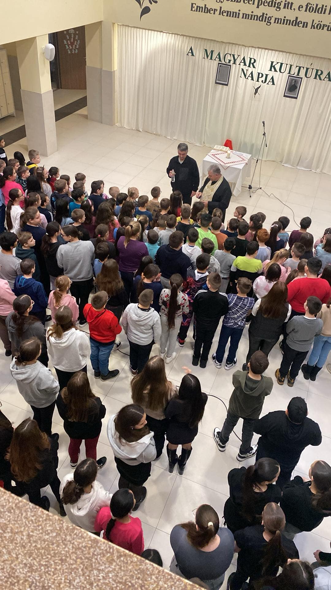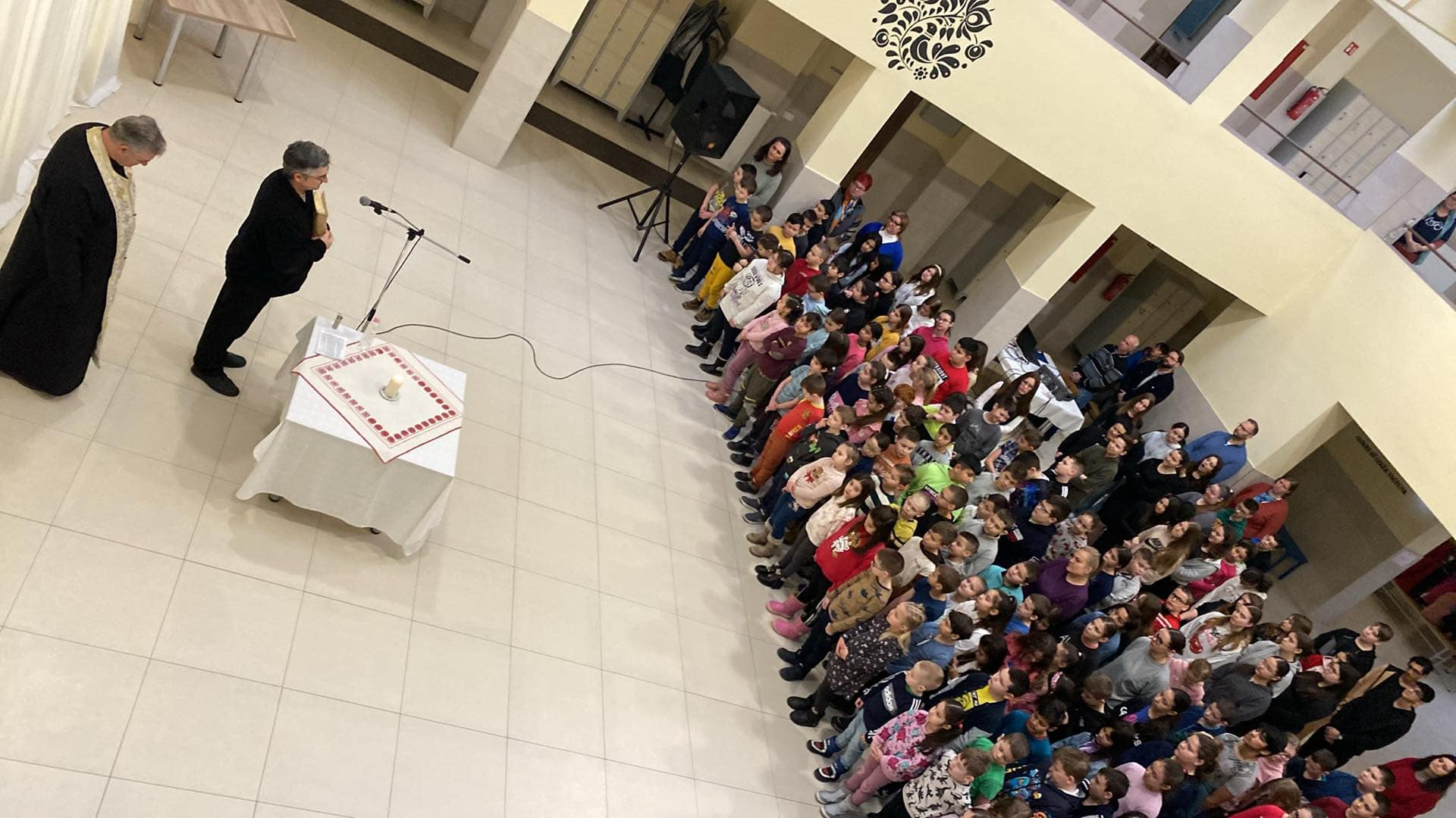 A szertartás során a gyerekek izgatottan figyelték a lelkészek szavait, érezve a pillanat fontosságát. Az áhítat végén a parókus megáldotta a diákokat, szenteltvízzel meghintette őket, hogy bátorsággal és elszántsággal nézzenek szembe a kihívásokkal. A szentelés alatt a pedagógusok és tanítványaik meghatóan énekeltek egy keresztény ifjúsági éneket: ,, Jézus életem, erőm, békém, Jézus társam, örömöm, Benned bízom, Te vagy az Úr ... "
